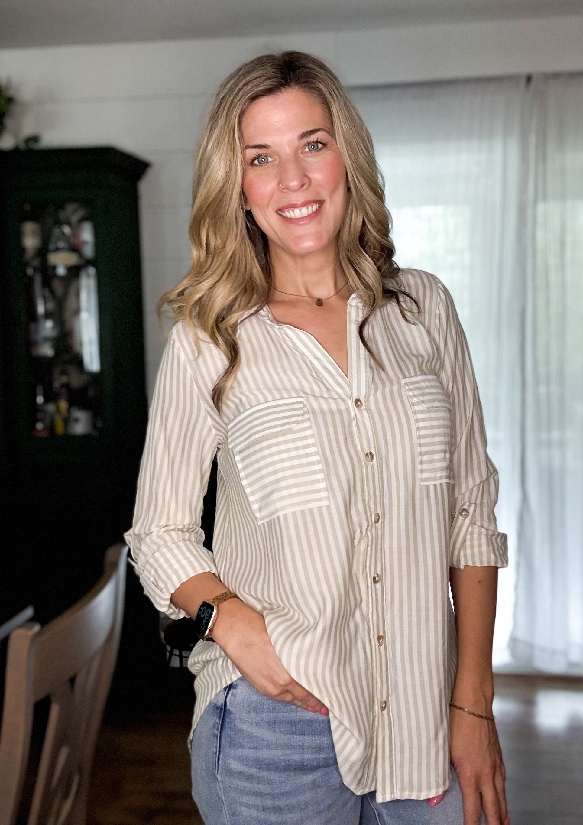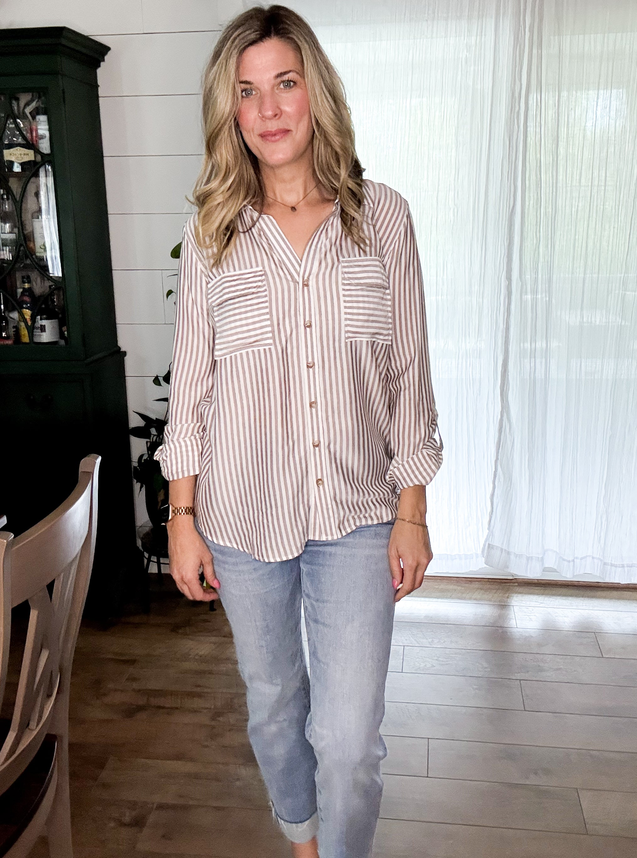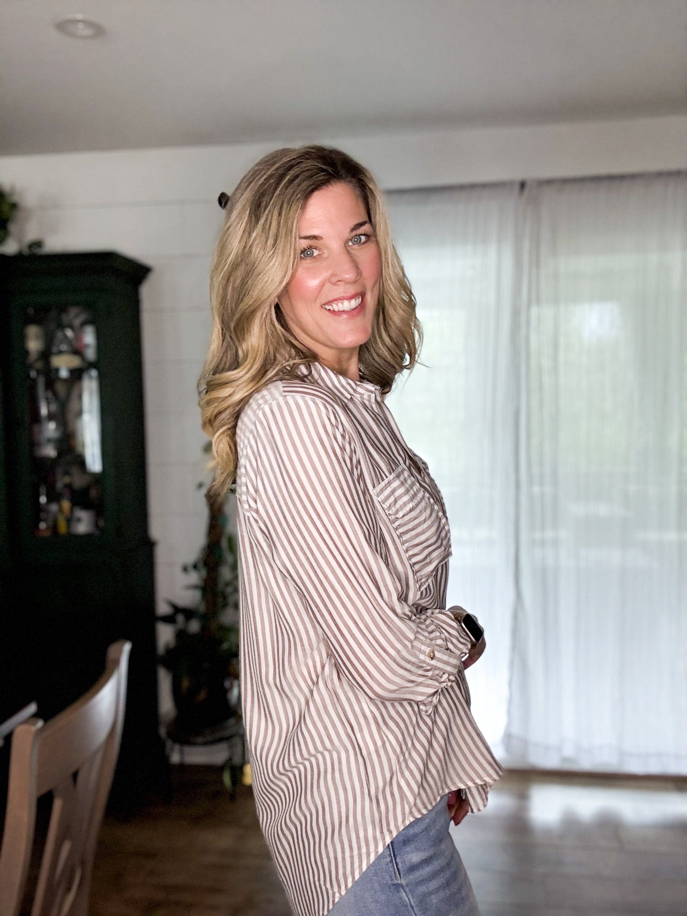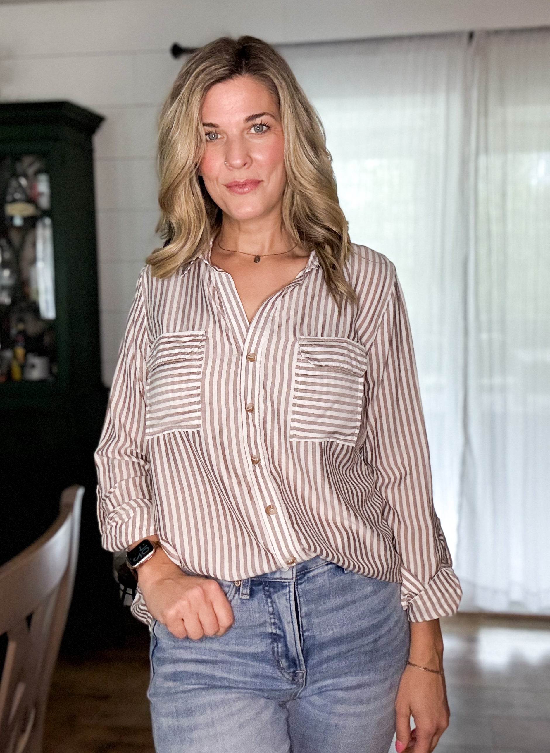 The Jani Top brings striped charm and serious versatility. This collared button-down features long sleeves with buttoned cuffs, a roll-up tab for easy styling, and a structured back yoke. Unlined and effortlessly cool, it's the shirt that works as hard as you do.