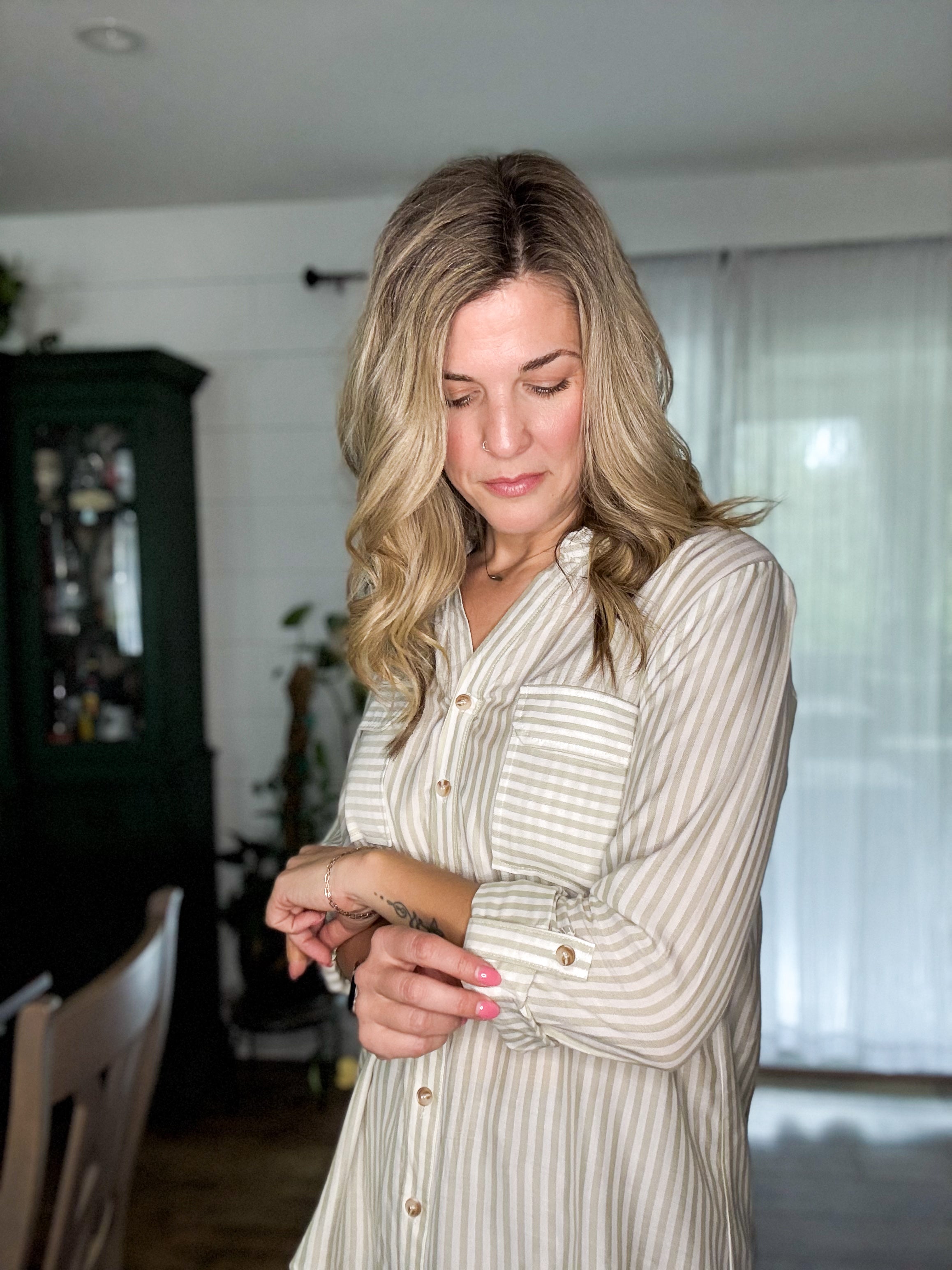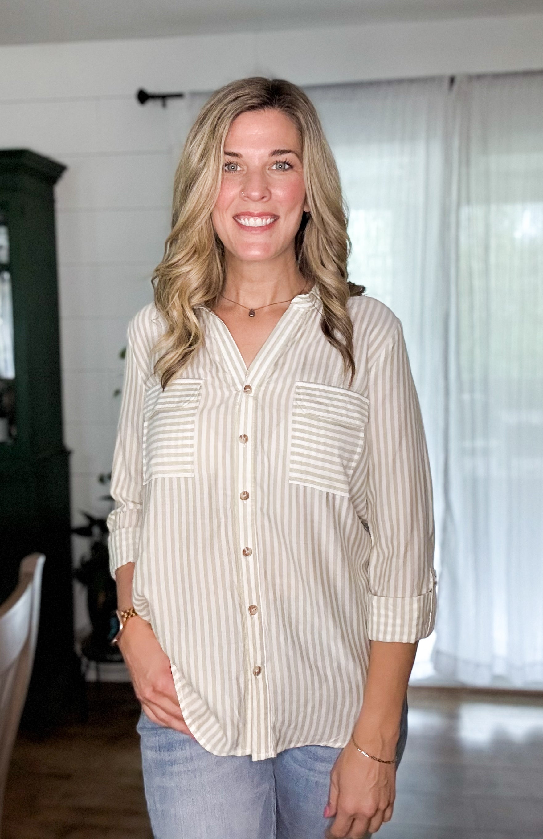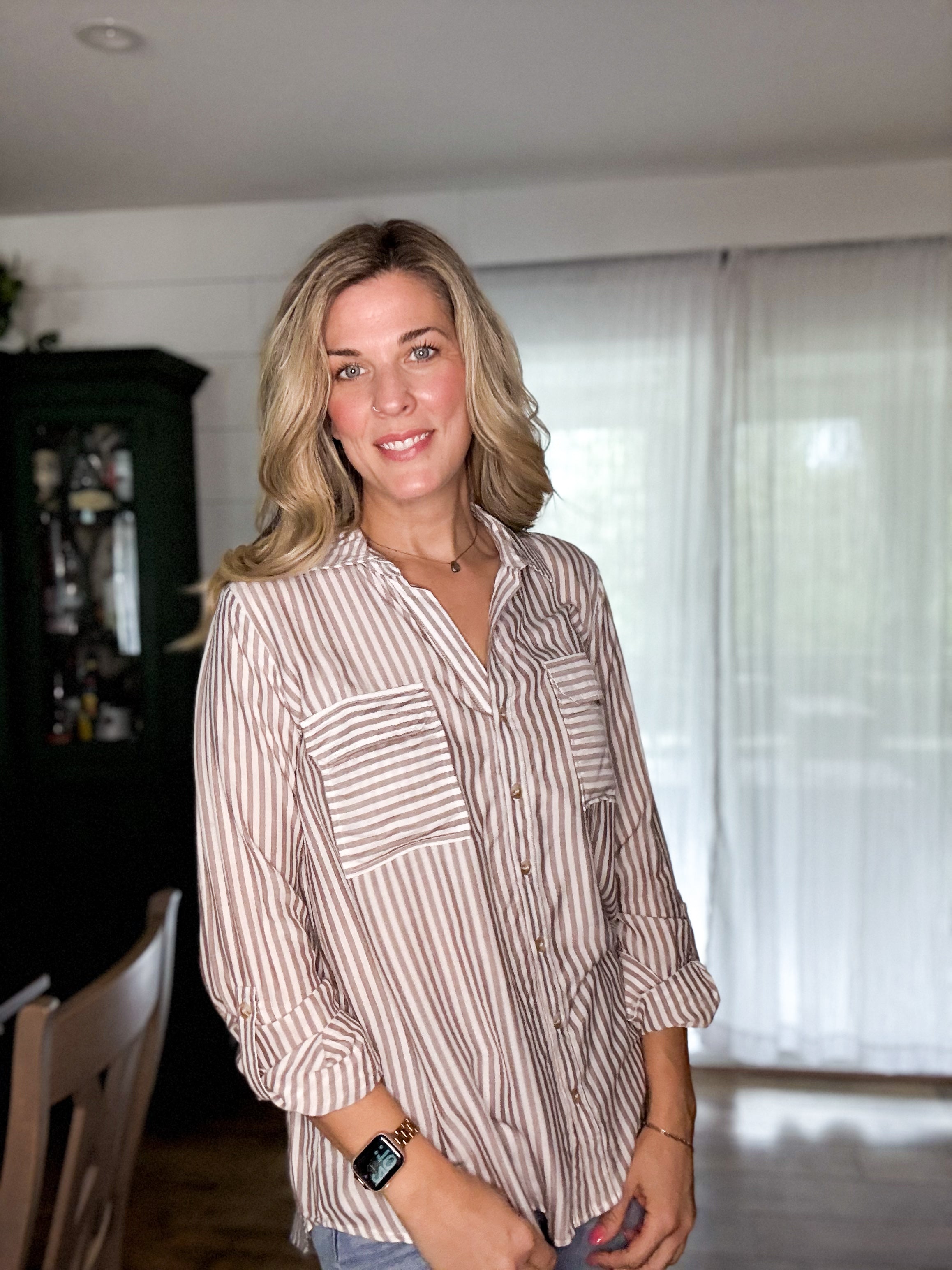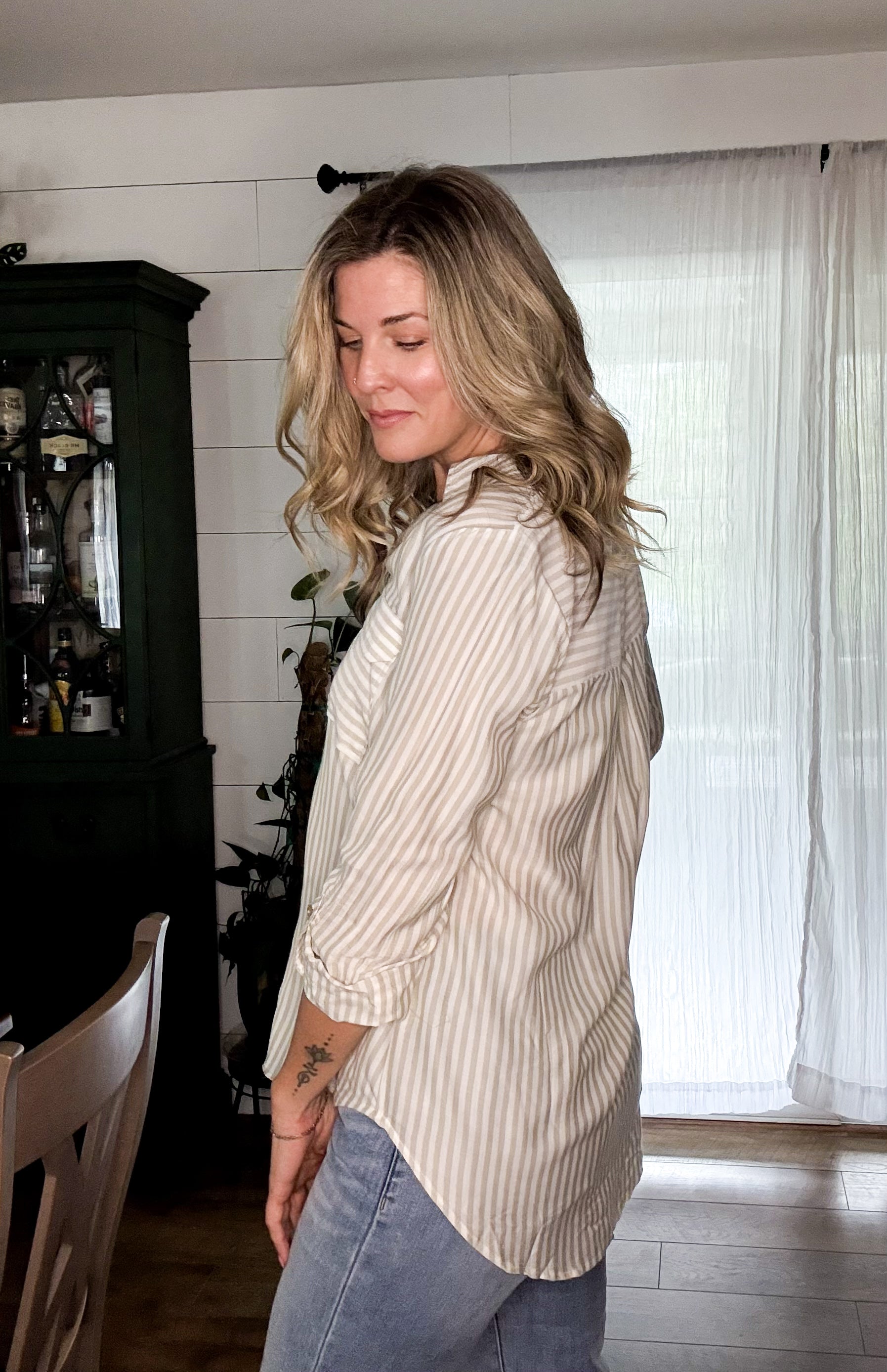 The Jani Top brings striped charm and serious versatility. This collared button-down features long sleeves with buttoned cuffs, a roll-up tab for easy styling, and a structured back yoke. Unlined and effortlessly cool, it's the shirt that works as hard as you do.